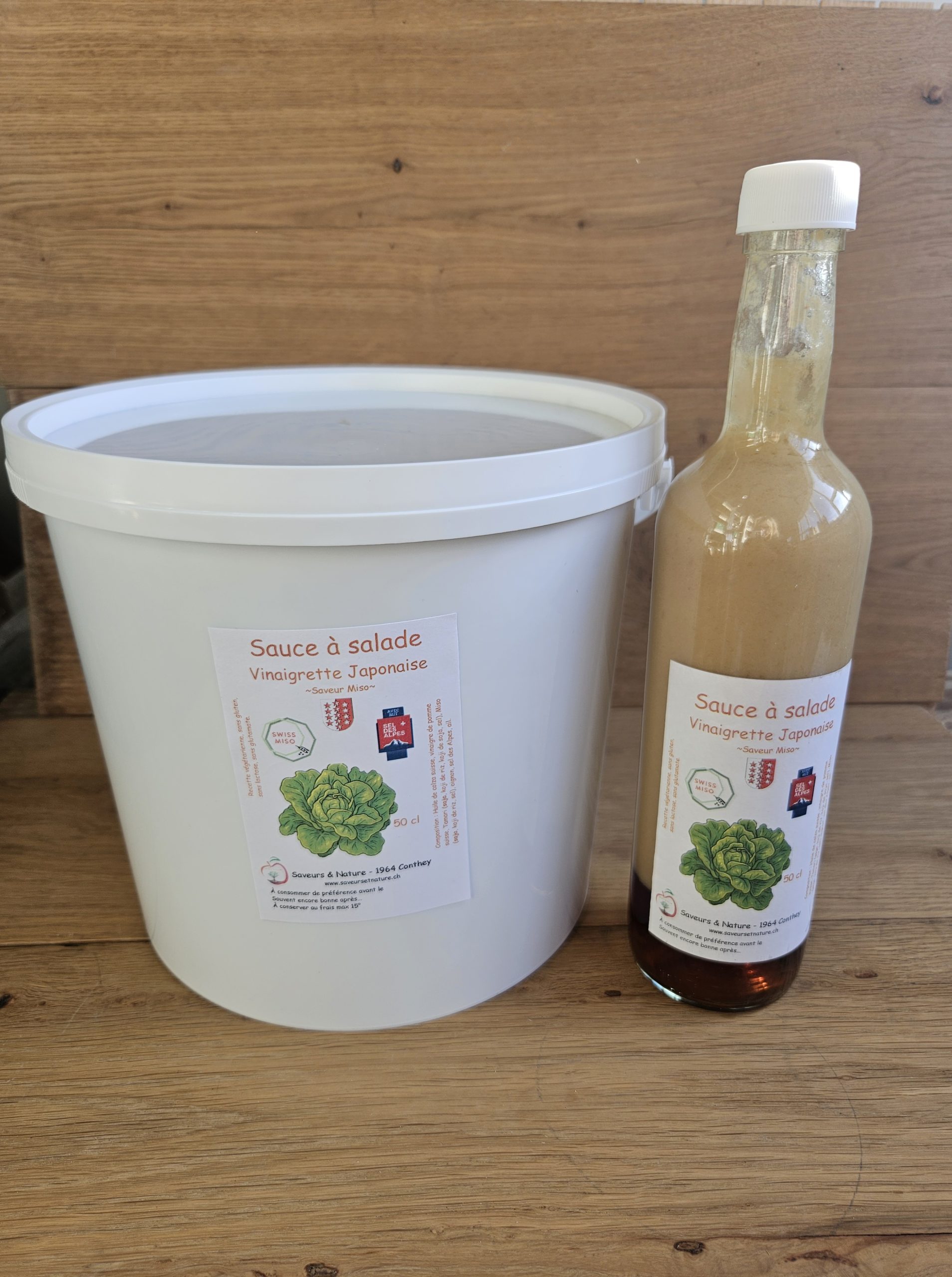 Composition : huile de colza suisse, vinaigre de pomme suisse, Tamari (soja, koji de riz, koji de soja, sel), Miso (soja, koji de riz, sel), oignon, sel des Alpes, ail.